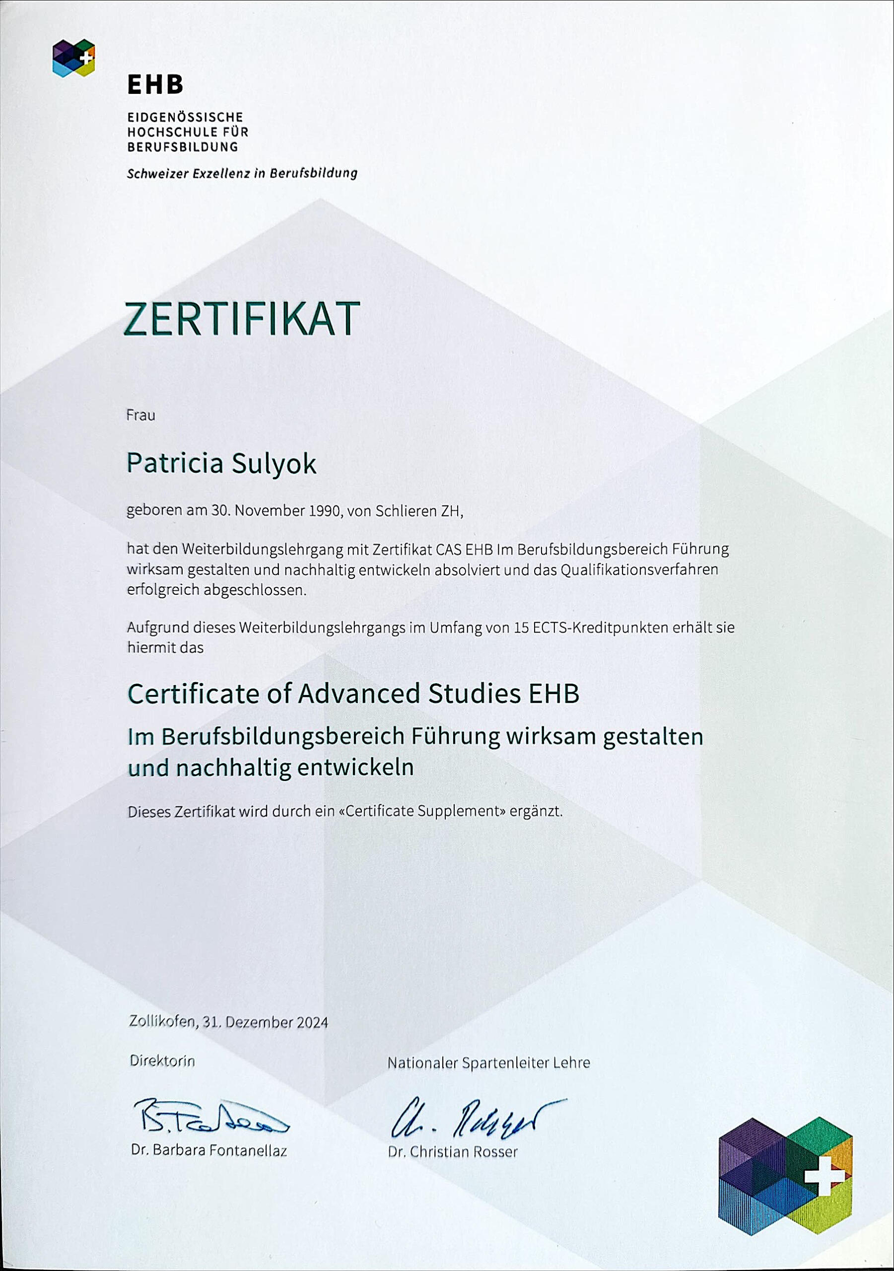 Neben meinem Bachelor- und Masterabschluss in Deutschen Sprach- und Literaturwissenschaften habe ich das Lehrdiplom für Maturitätsschulen sowie eine berufspädagogische Zusatzqualifikation und einen CAS in Führung und Schulleitung erlangt.